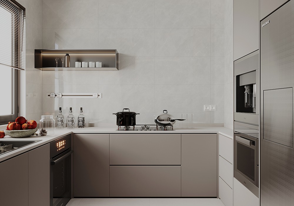以灰為主調(diào),色澤豐潤,再現(xiàn)原石生命特征,若隱若現(xiàn)的流沙溝壑,勾勒空間大氣恢弘的氣度。