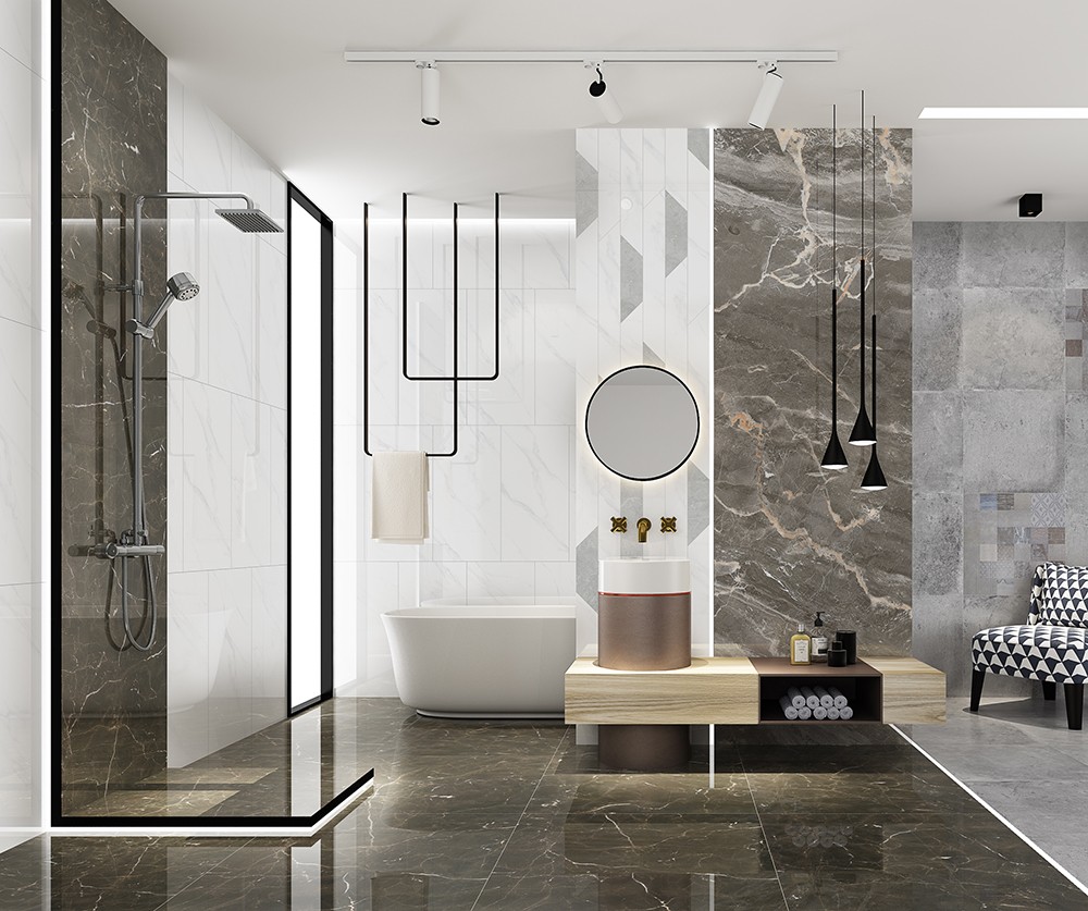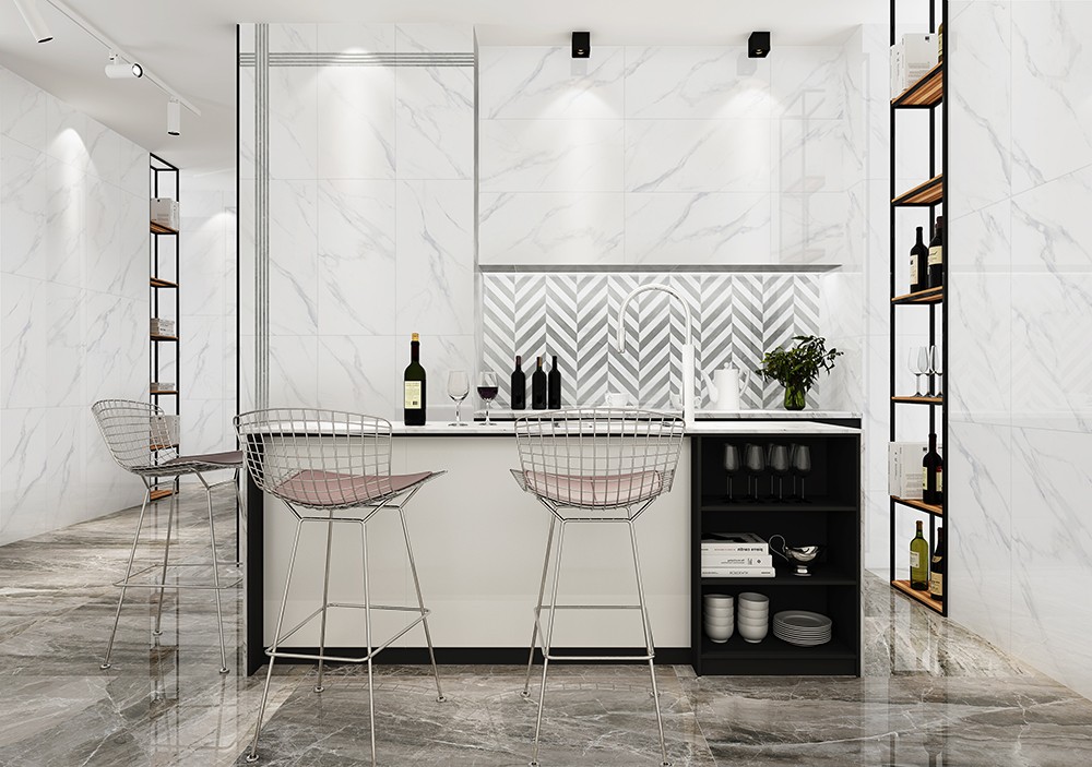 以阿爾卑斯山脈為設計靈感來源,純凈剔透的磚面結(jié)合行云流水般的淡淡的灰色線條,柔和卻充滿著力量,紋理渾然天成,灰白之間,彰顯淡雅,紋理淡淡稀少,磚面盡量留白。