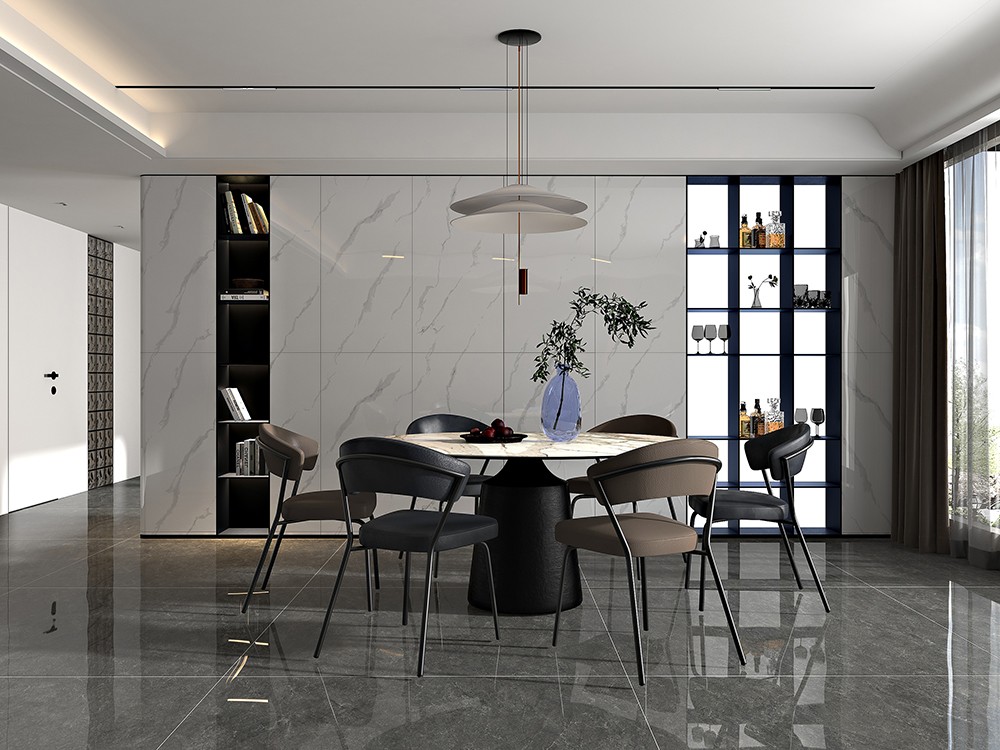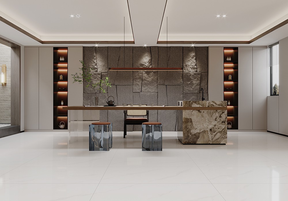 帕米拉白色澤白如雪,顆粒細膩,純正的白色,鑲嵌著很多淺的灰色,紋路清晰,紋理天然自成,在這個雅致、簡約的現代空間之中,演繹出一種時尚藝術的神韻。