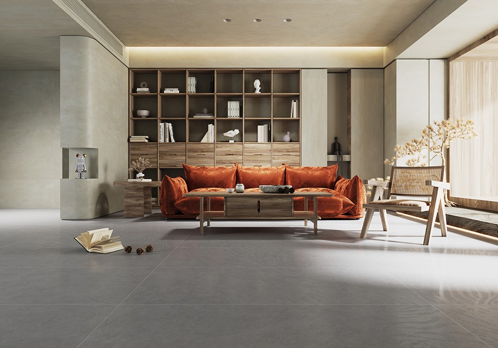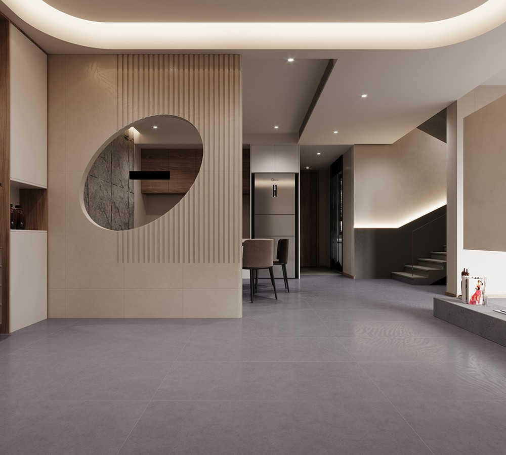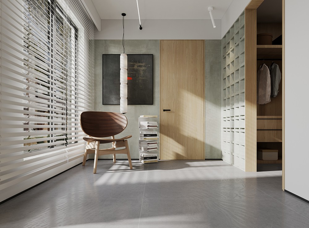磚面略帶原始粗糙的質感,象征著一種帶有厚重感的原始生命力,青巖灰微水泥與木色的軟裝的碰撞,中和了空間的生活氣息。