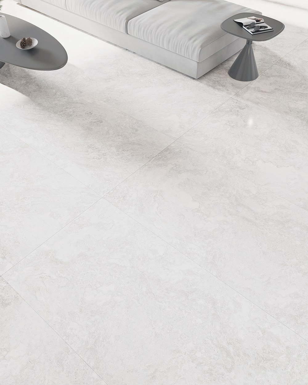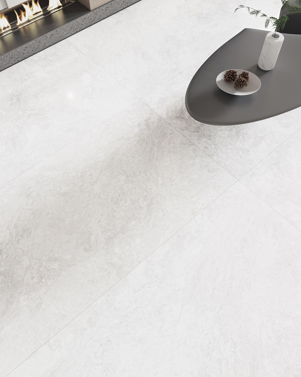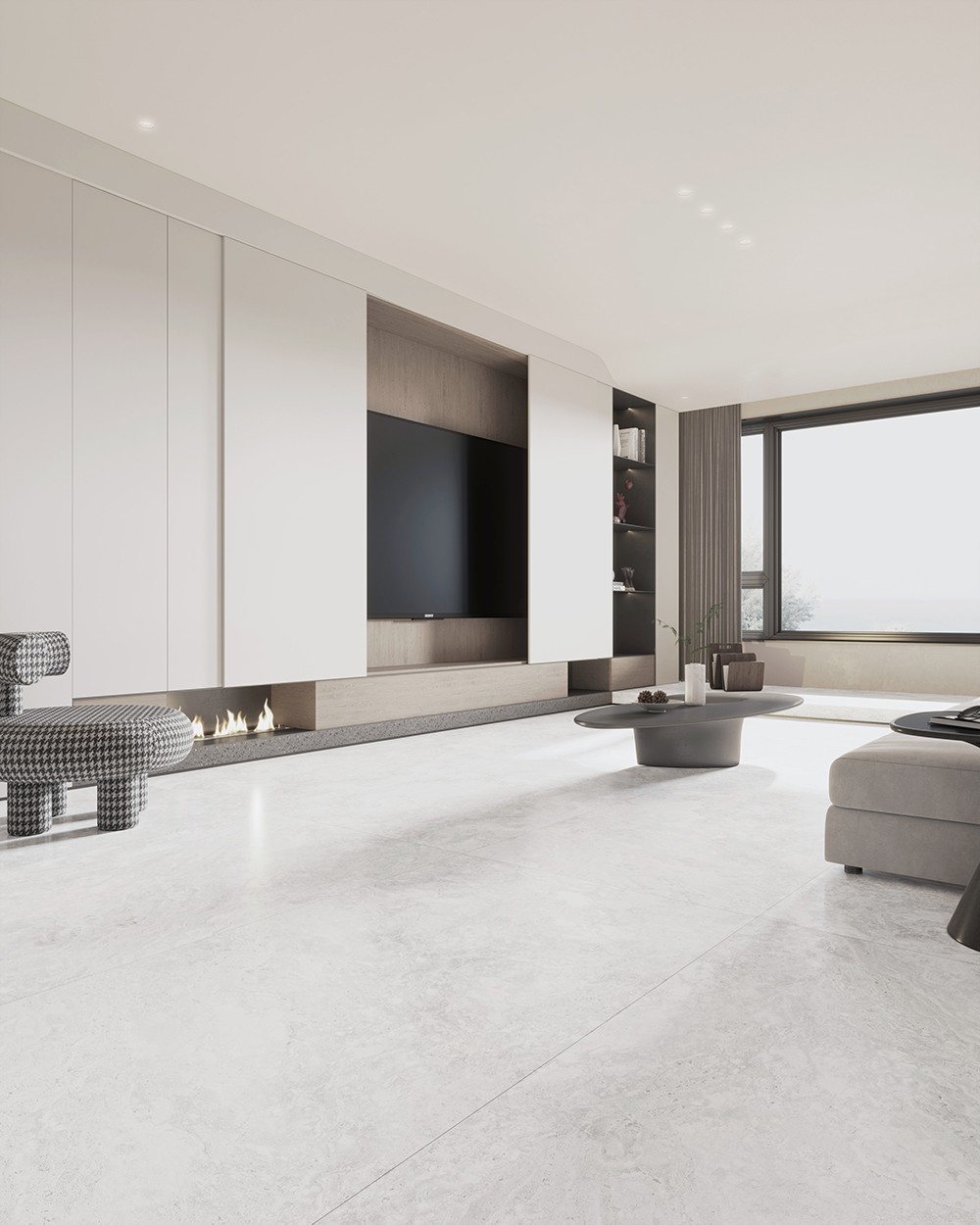 以白灰色為主調(diào),細(xì)膩再現(xiàn)了天然洞石標(biāo)志性的自然孔洞與條紋,仿佛歲月沉淀下的溫柔印記。保留石材原有質(zhì)樸感的同時賦予其純凈而不失溫暖的美感。