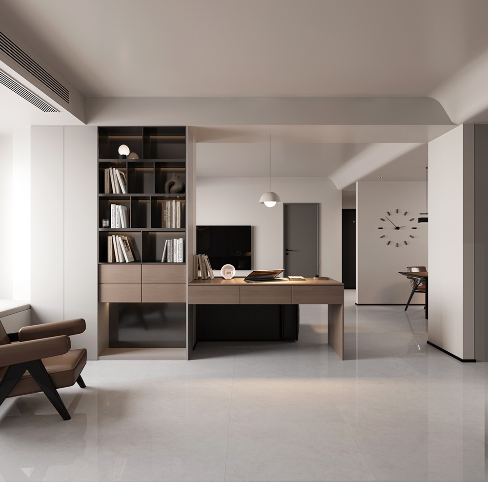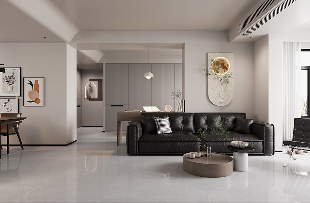 以灰白為底色,巧妙地利用淺灰色線條在磚面上勾勒出縱橫交錯(cuò)的紋理,仿佛山脈延綿的自然曲線,既流暢又充滿韻律感。