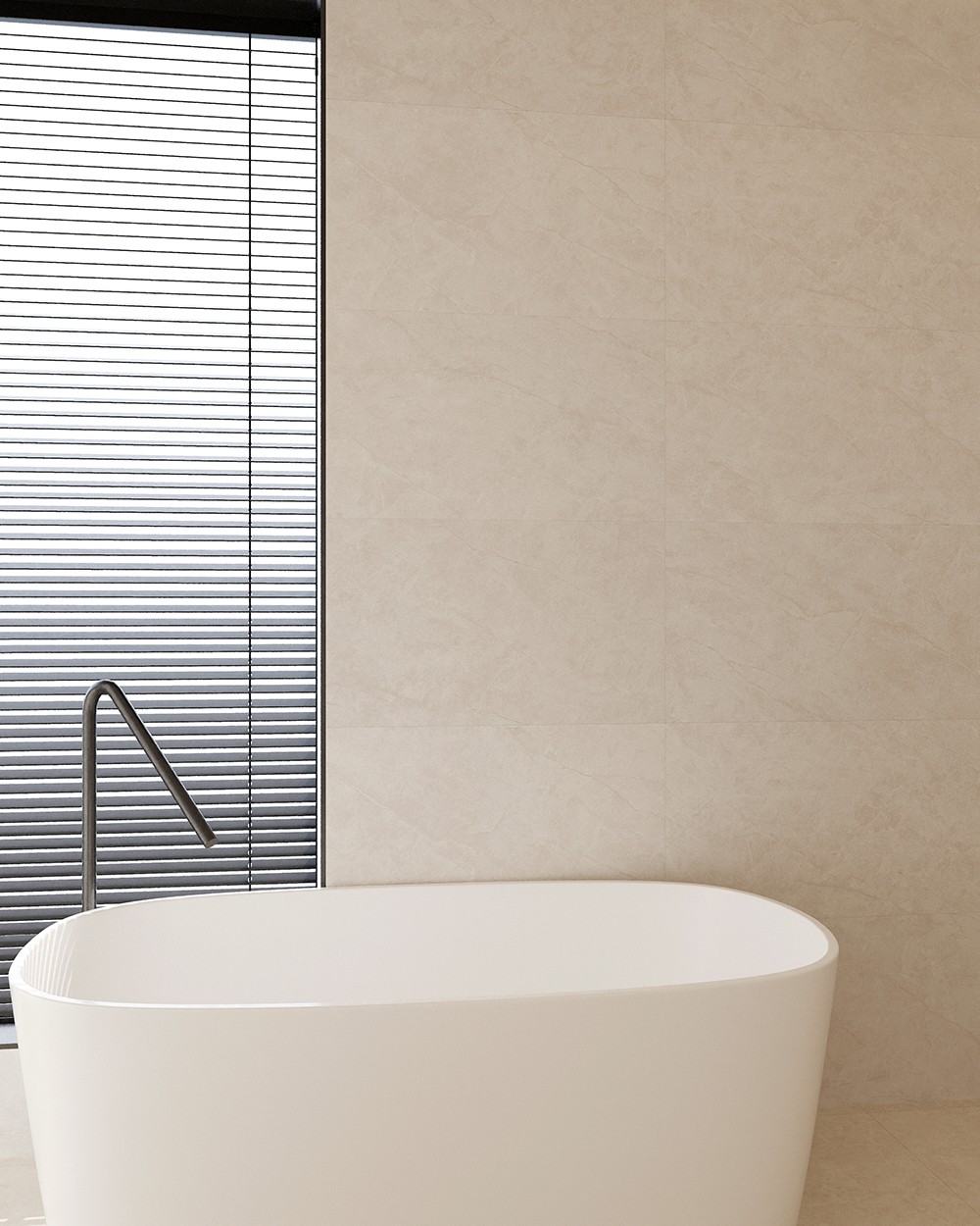 以灰白為底色,巧妙地利用淺灰色線條在磚面上勾勒出縱橫交錯的紋理,仿佛山脈延綿的自然曲線,既流暢又充滿韻律感。