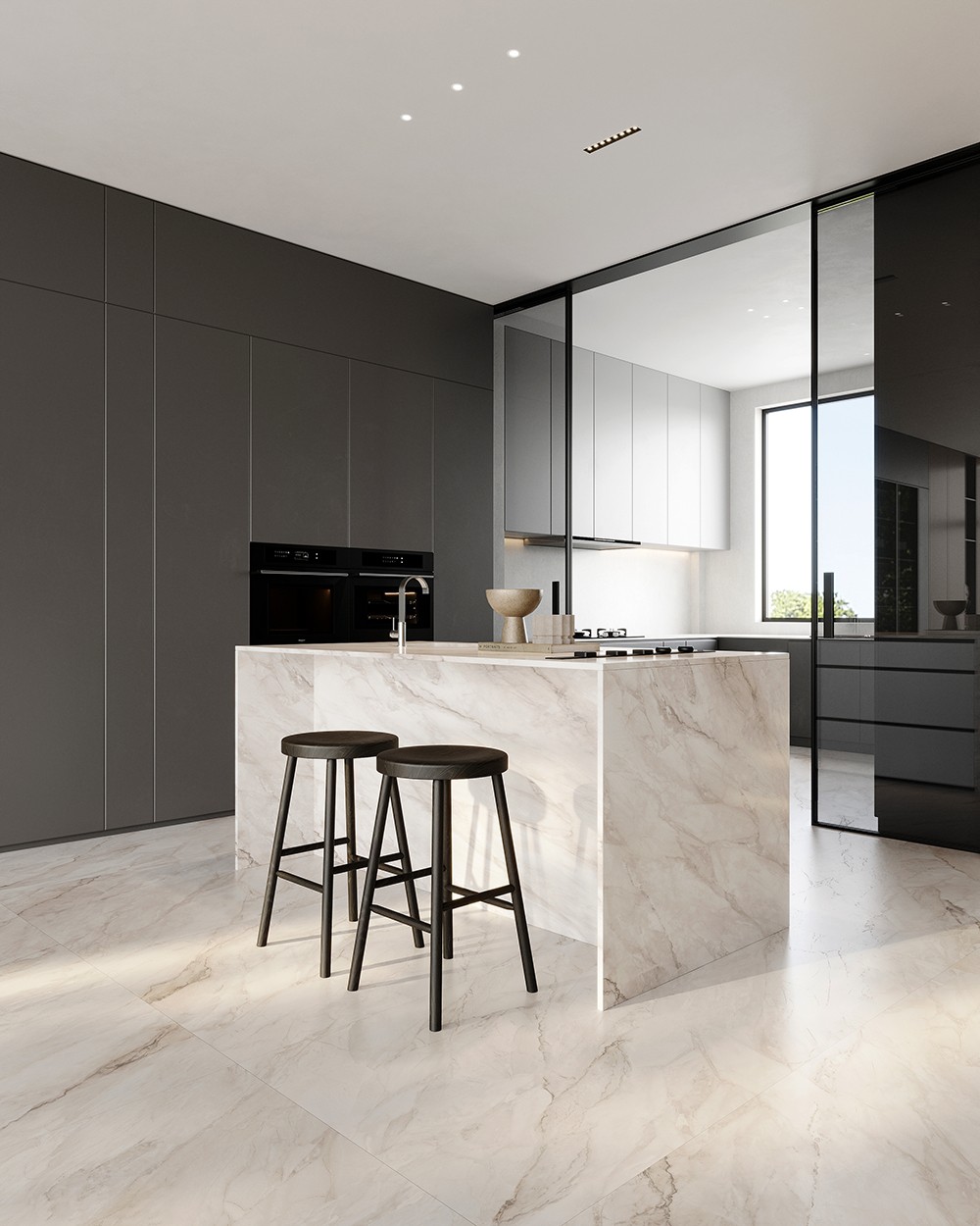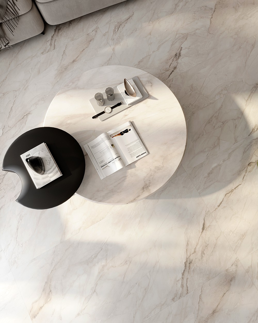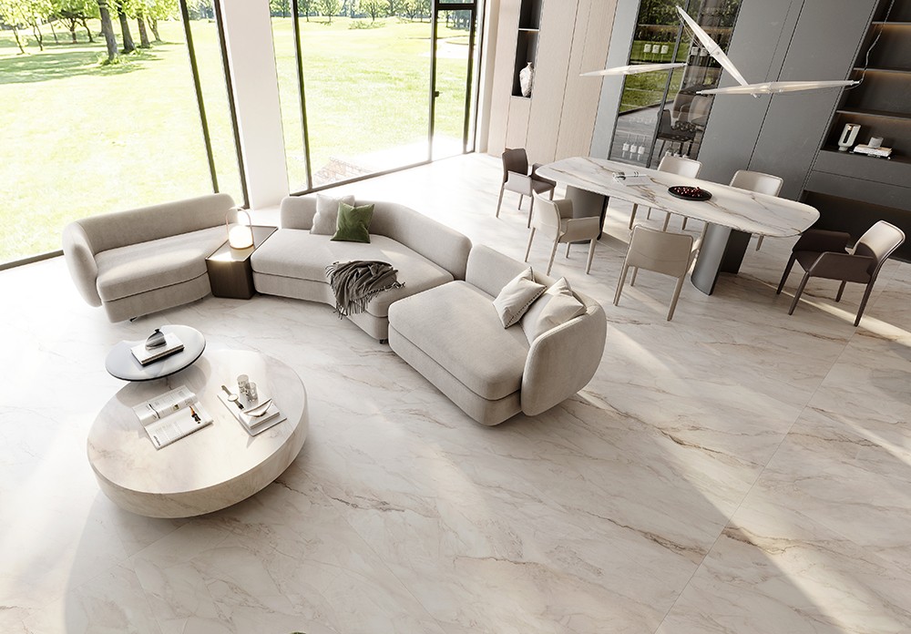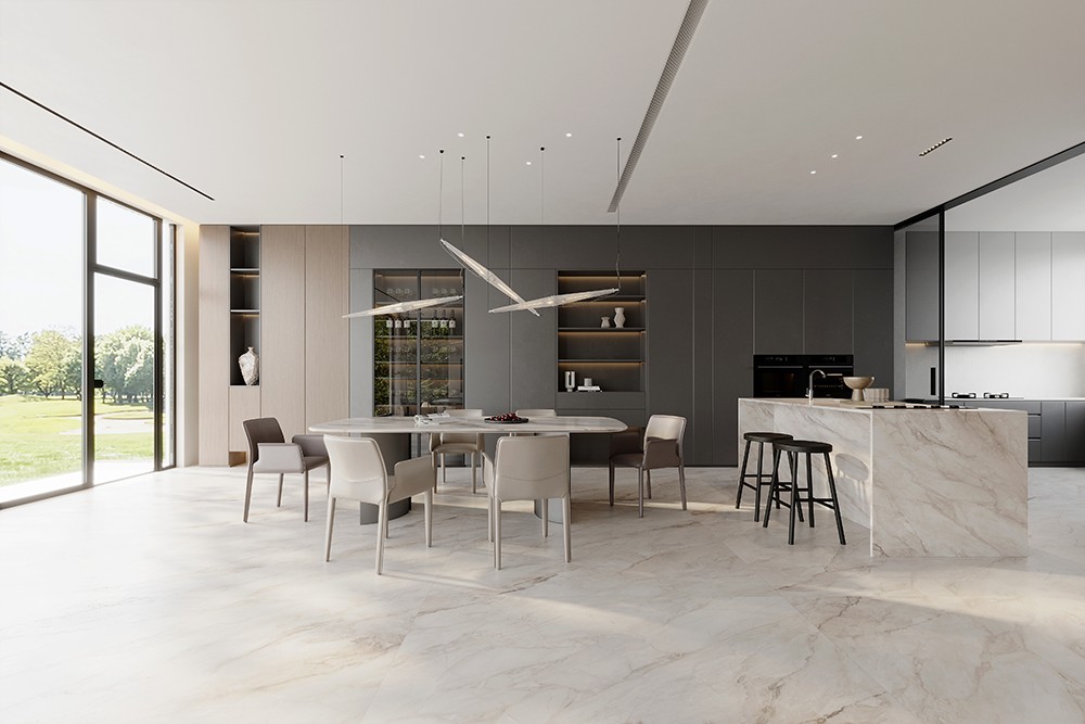 紋理修長而開闊,深淺有序;白色之上泛起層層灰質(zhì)綢帶。