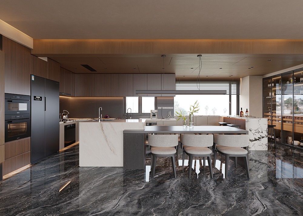 紋理如星河傾瀉、海影浮動(dòng)。用山川滄海的生動(dòng)浪漫,賦予空間詩(shī)意浪漫與大氣典雅的格調(diào)。