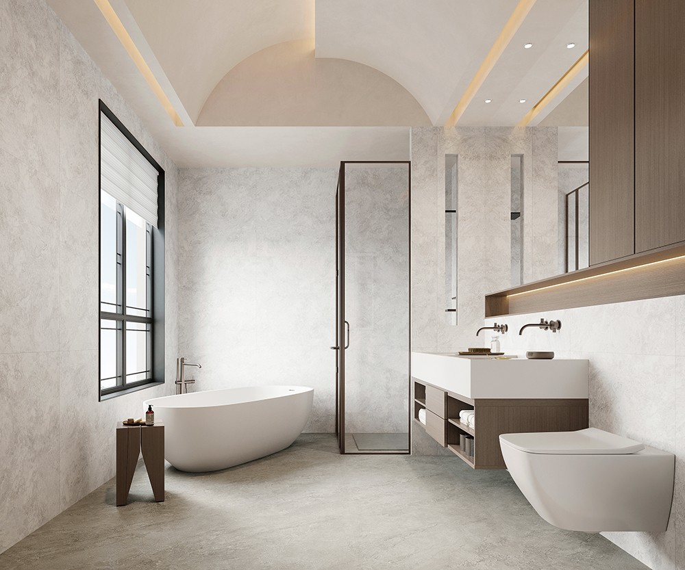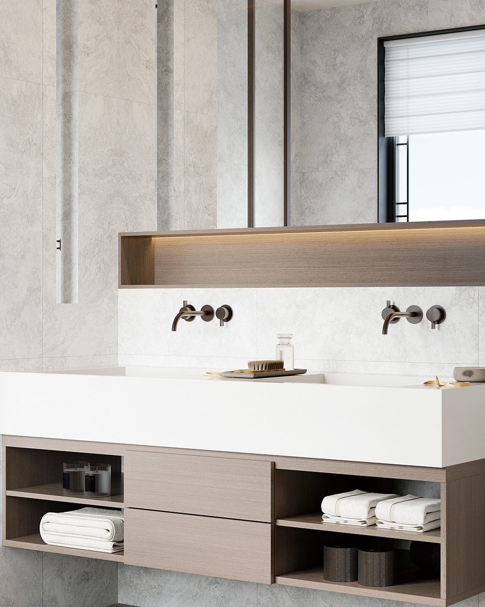 以白灰色為主調(diào),細(xì)膩再現(xiàn)了天然洞石標(biāo)志性的自然孔洞與條紋,仿佛歲月沉淀下的溫柔印記。保留石材原有質(zhì)樸感的同時賦予其純凈而不失溫暖的美感。