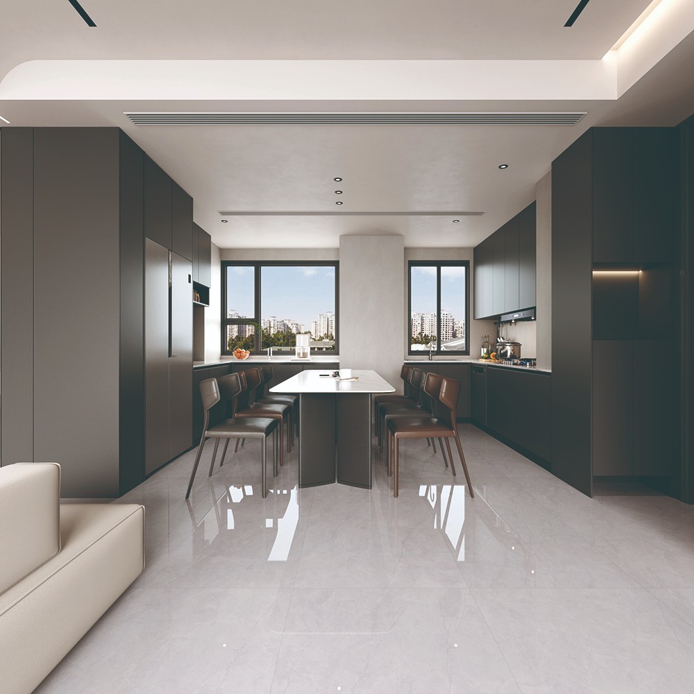 以灰白為底色,巧妙地利用淺灰色線條在磚面上勾勒出縱橫交錯的紋理,仿佛山脈延綿的自然曲線,既流暢又充滿韻律感。